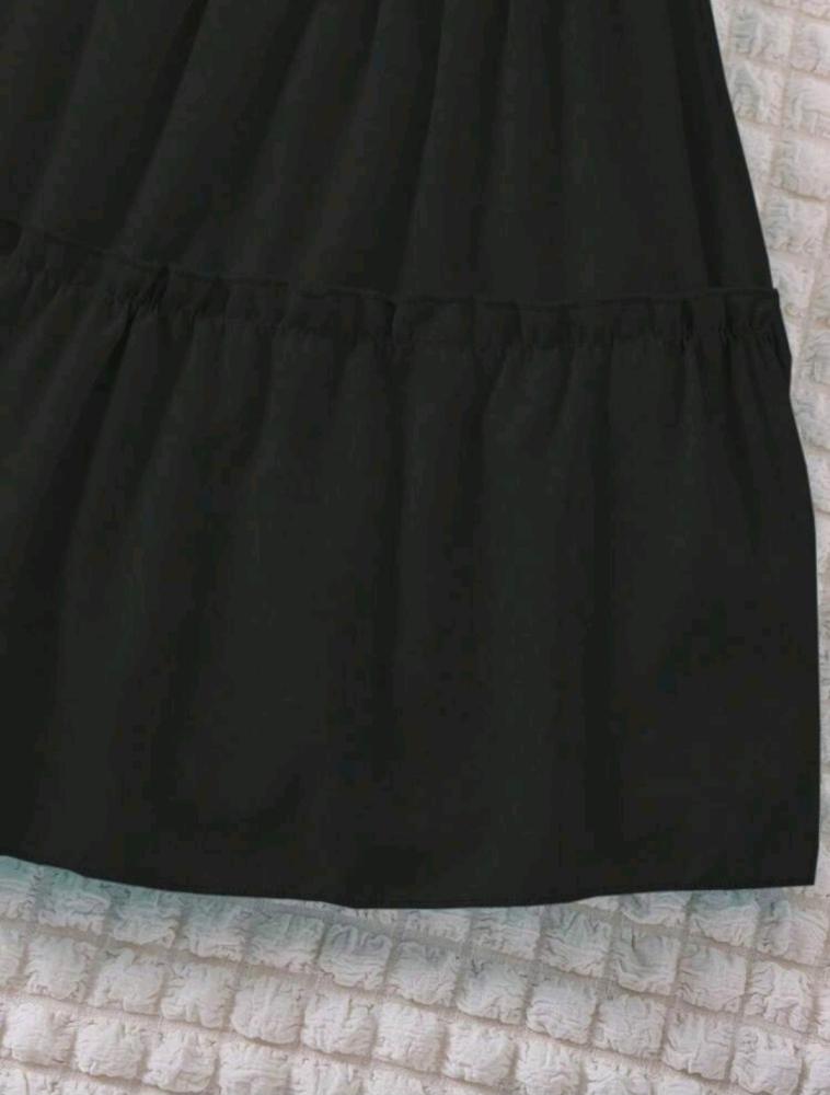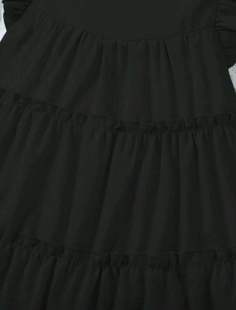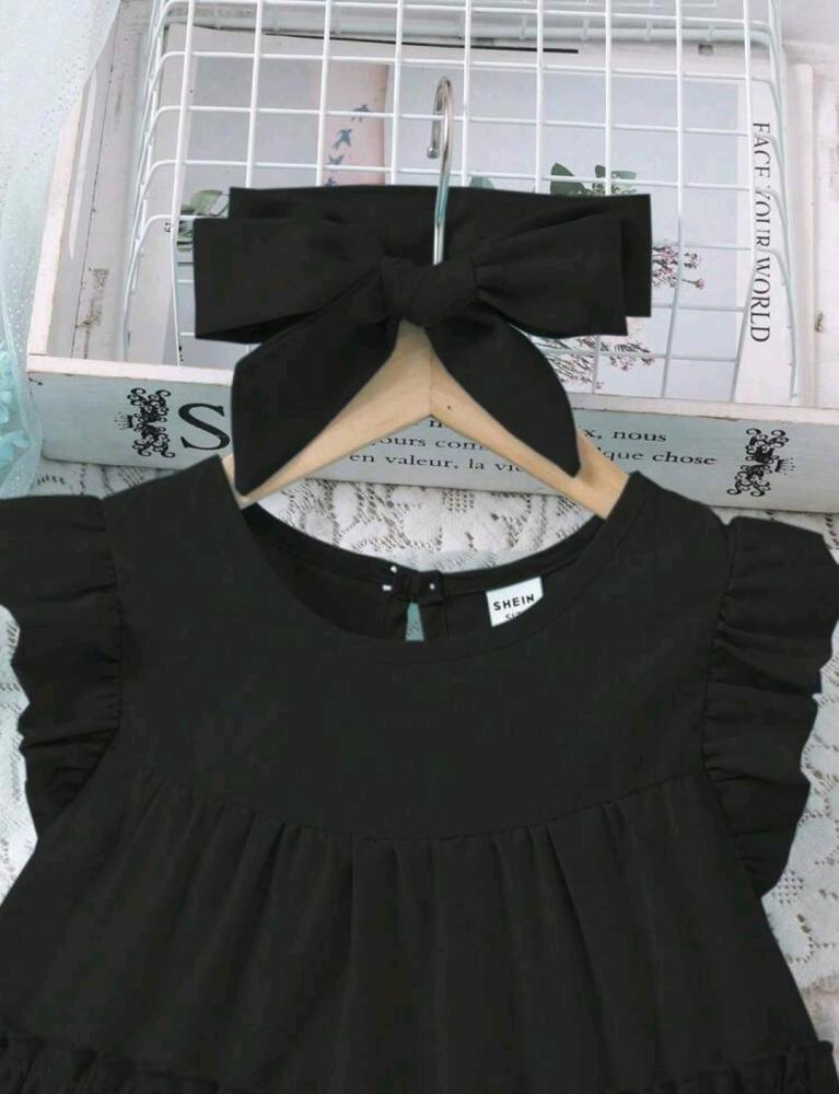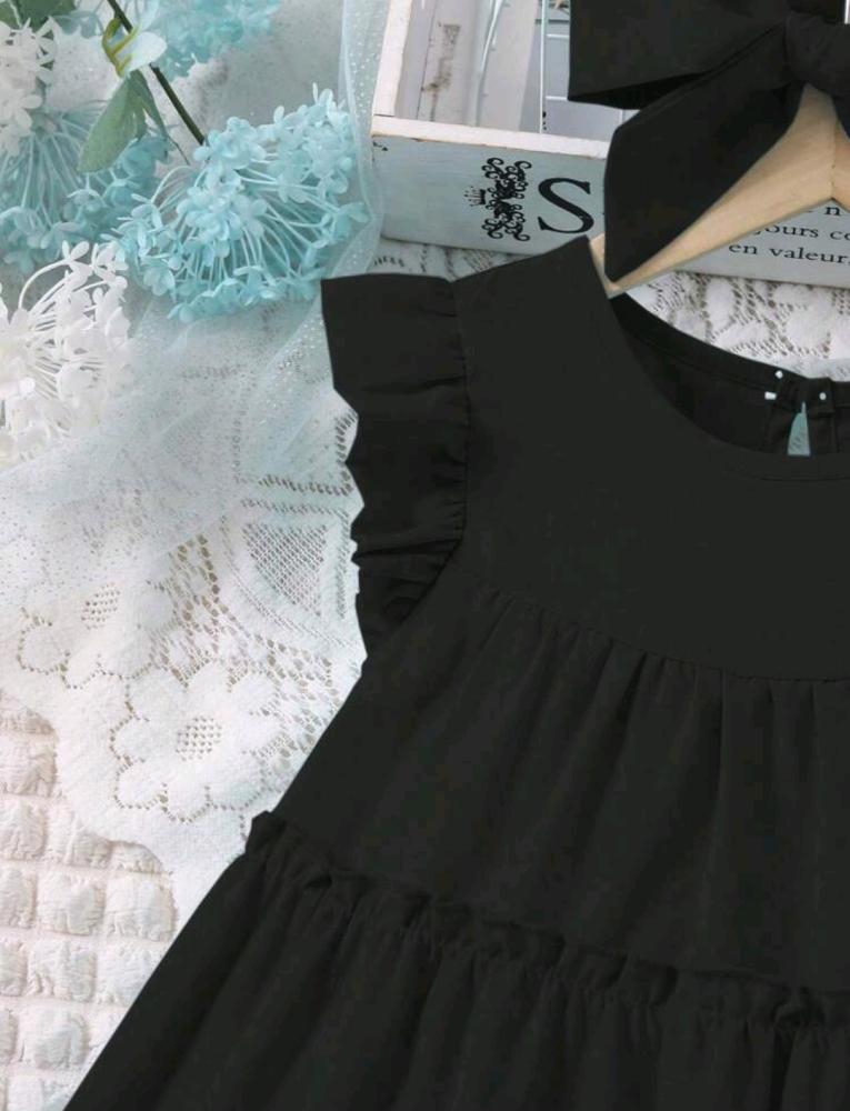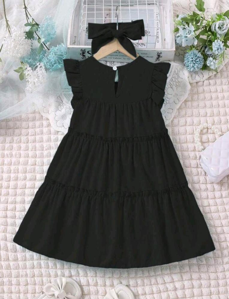 فستان بناتي أسود - ربع كم - مع كشكش خفيف - مع طوق شعر - أسود