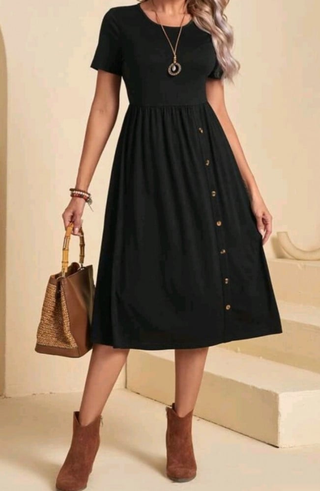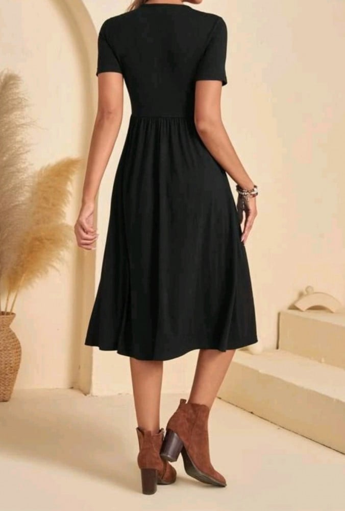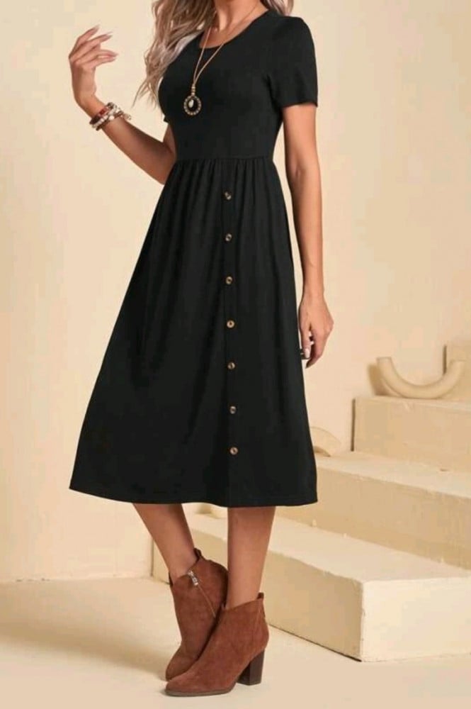 فستان نسائي أسود نصف كم بأزرار سفلية - EMERY ROSE